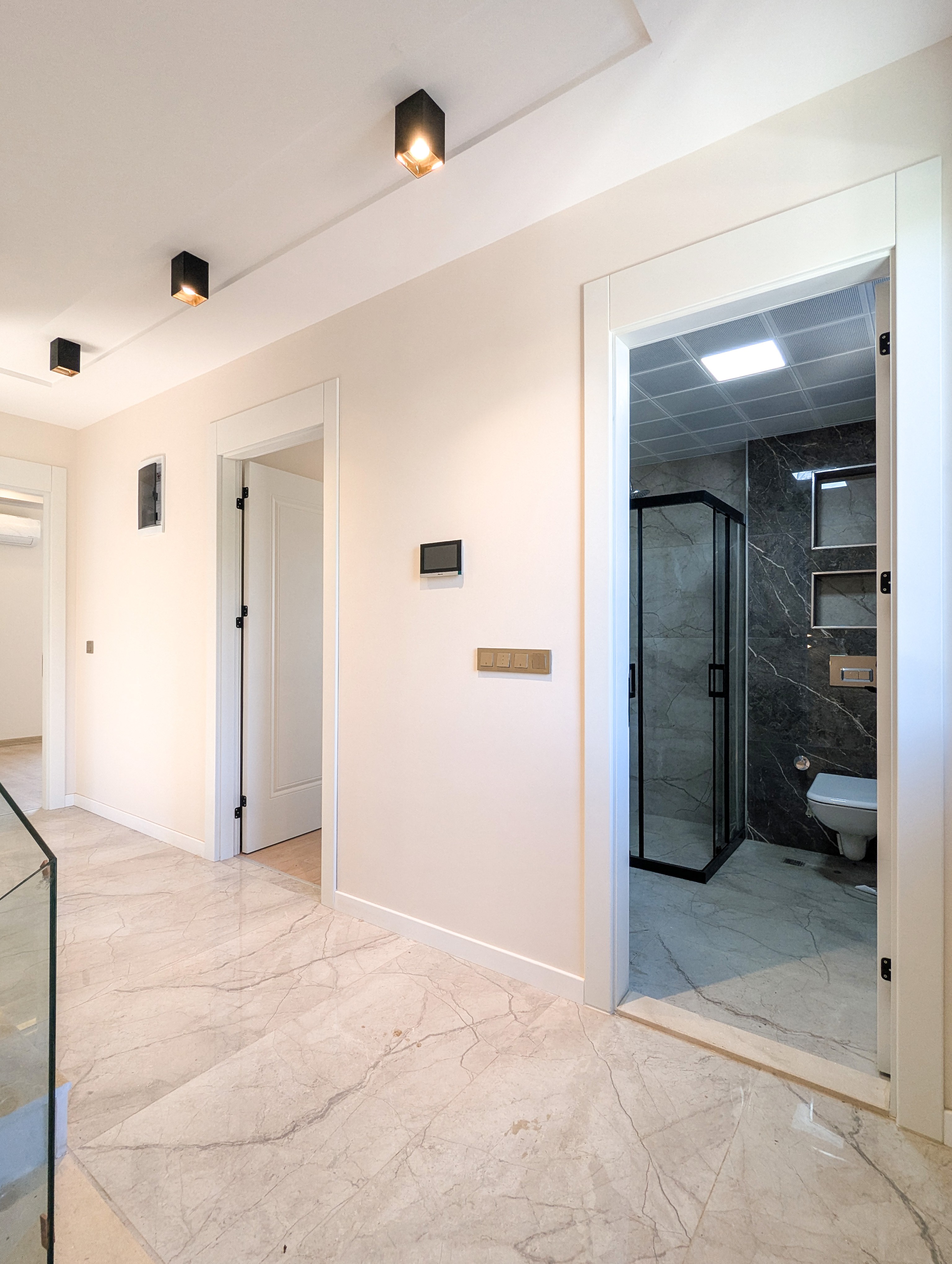 تضم غرفة النوم الرئيسية حماماً خاصاً وغرفة ملابس، إضافة إلى خزانة مدخل تسهم في تنظيم المساحة الداخلية. توفر الستائر الكهربائية سهولة في الاستخدام، فيما تتيح البنية التحتية للغاز الطبيعي إمكانية التوصيل مستقبلاً.