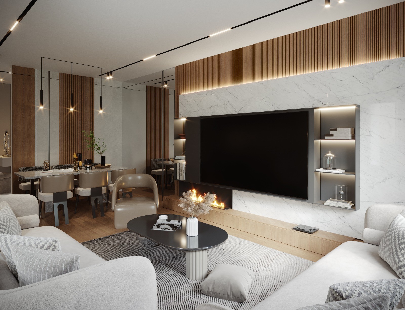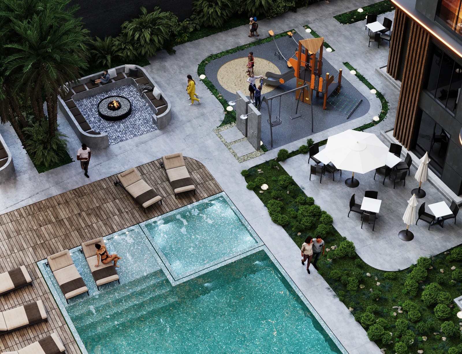 Modern and Comfortable Living SpacesApartments and villas under construction are built with modern architecture and high-quality materials. Designed for a comfortable life, they feature smart home systems, spacious balconies, modern kitchens, and airy living spaces. The villas are equipped with private pools, large gardens, and panoramic views. Additionally, on-site amenities include swimming pools, gyms, children's play areas, Turkish baths, saunas, and various social areas.