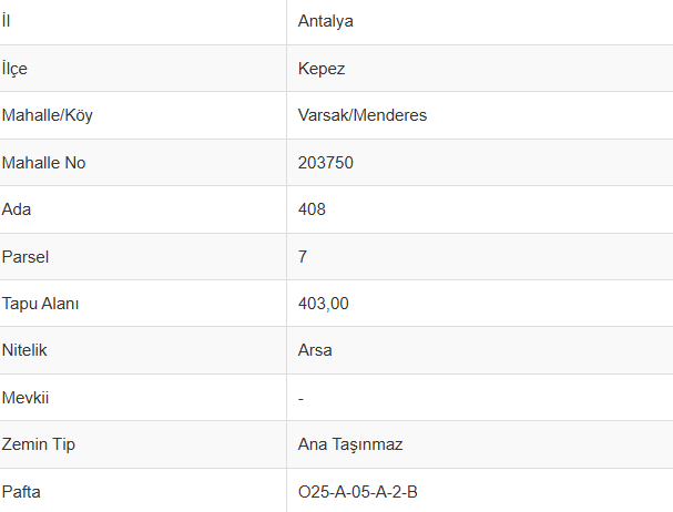 Kepez Varsak’ta satılık 403 m² Yatırımlık Arsa