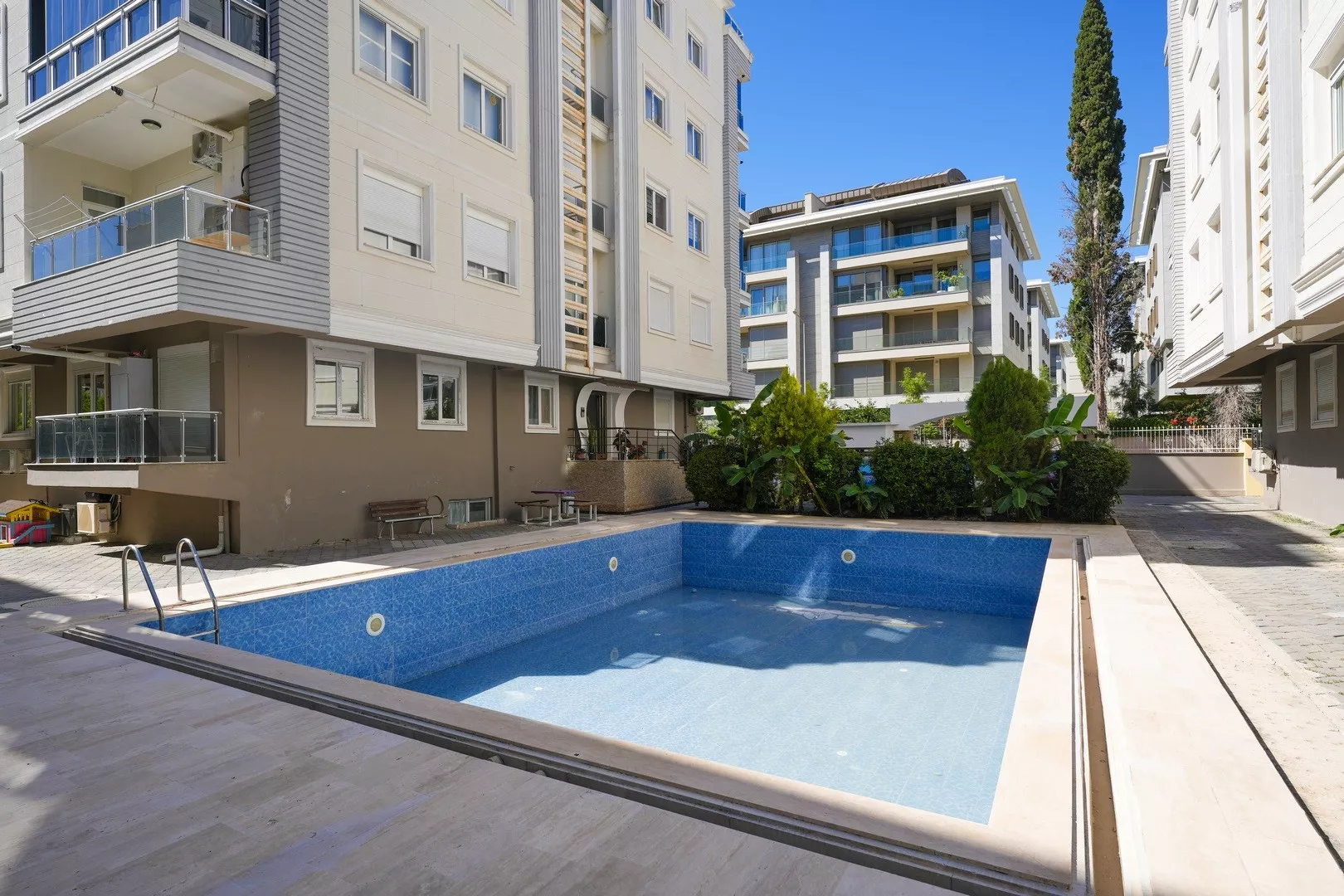 Bu dairedeki en cazip özelliklerden biri de açık yüzme havuzu. Yazın sıcak günlerinde serinlemek için idealdir. Ayrıca, denize sadece 2.5 km uzaklıkta olması, sahilde zaman geçirmek isteyenler için kolay erişim imkanı sunuyor. Antalya Havalimanı'na 18 km mesafede bulunması sayesinde, şehir dışından misafirleriniz kolayca ulaşım sağlayabilir.