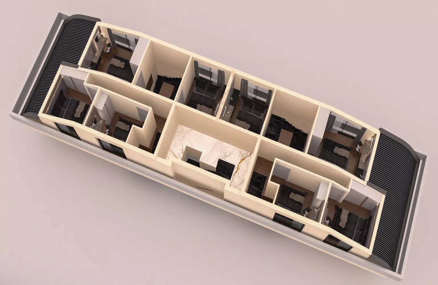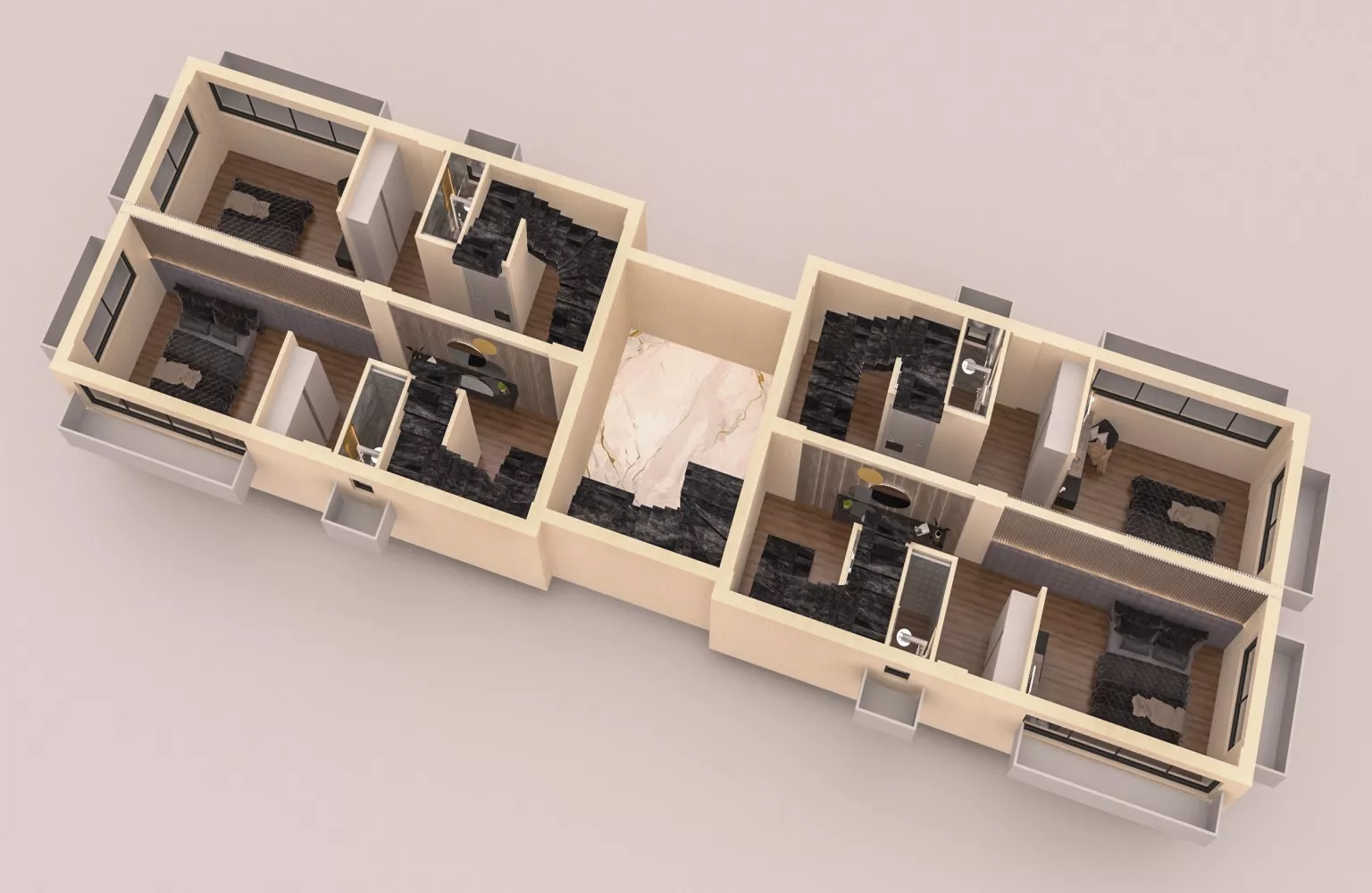 Dubleks daireler 1 yatak odası,banyo ve açık mutfaklı oturma odasından oluşmaktadır.