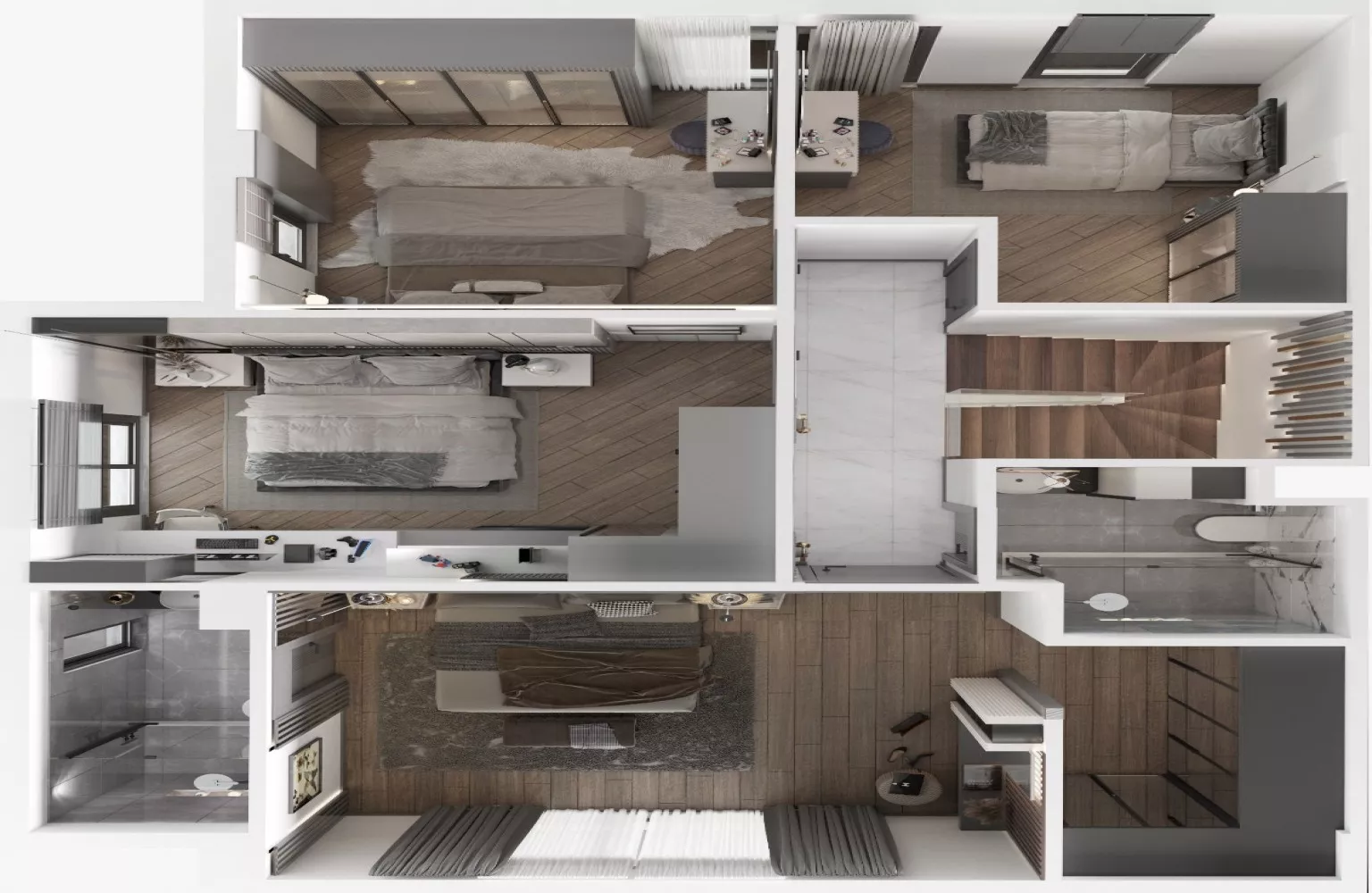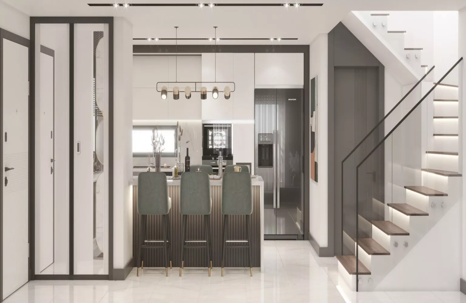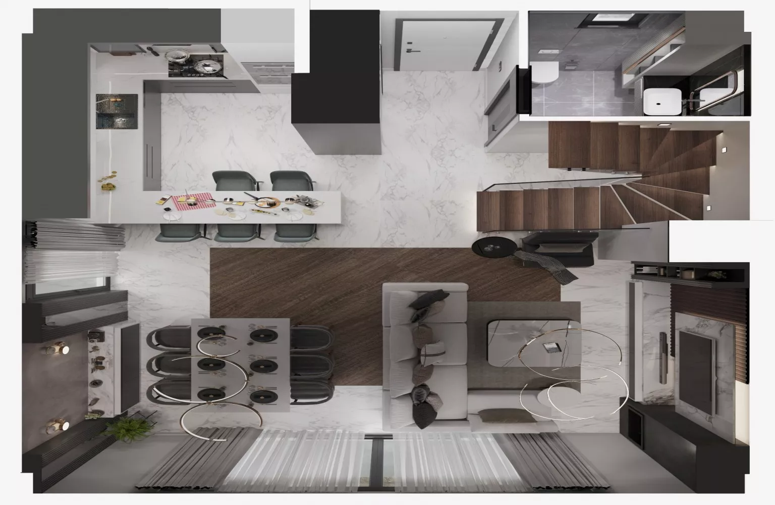 Yüksek tavanlar sayesinde ferahlık hissi yaratılırken, zemin altı ısıtma ve klima her mevsim konfor sağlamaktadır.