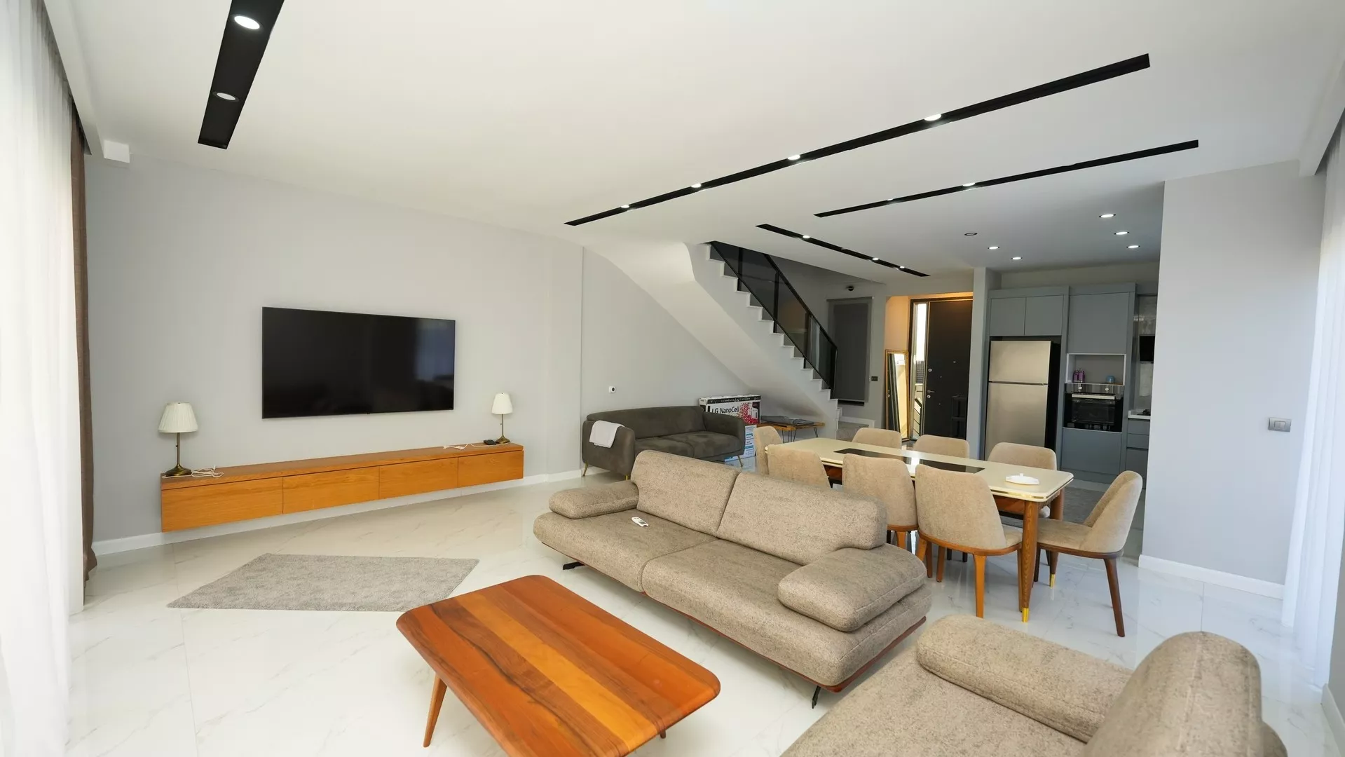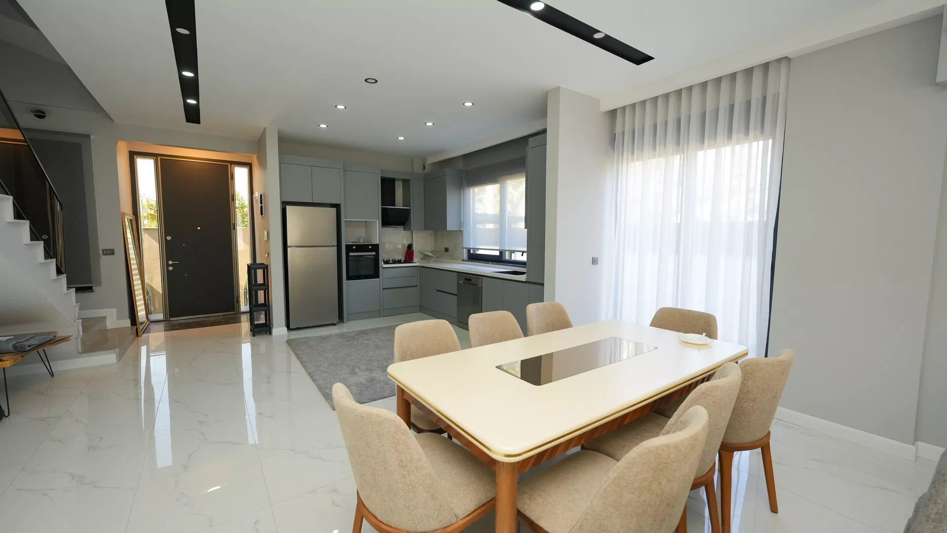 Bu özel villa, modern tasarımıyla dikkat çekerken, Amerikan mutfak, ebeveyn banyosu ve yerden ısıtma gibi günümüzün en çok tercih edilen özelliklerine sahip. Ankastre set ile donatılmış mutfak, aile yemekleri için mükemmel bir ortam sunarken, geniş teras alanı ve 2 balkon, açık hava keyfi için idealdir.